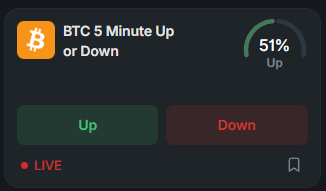 There are two popular markets on Polymarket right now. One has to do with what the 5 minute chart on BTC will look like in real time. This is effectively a derivative of BTC. You can see in this screenshot that there is a 51% probability that the 5 min BTC price ends up.