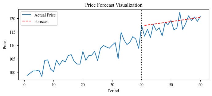 I’ve visualized these two broad applied methods below.4 The first type of method, forecasting, attempts to say something about the future: In the 60th period, the price will be 120.
