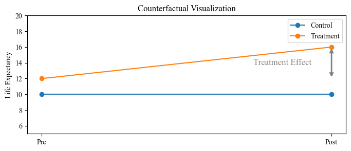 The second method attempts to say what could have happened (or, more generally, what would happen): If we apply this treatment, life expectancy will increase 4 years on average (the grey line).5